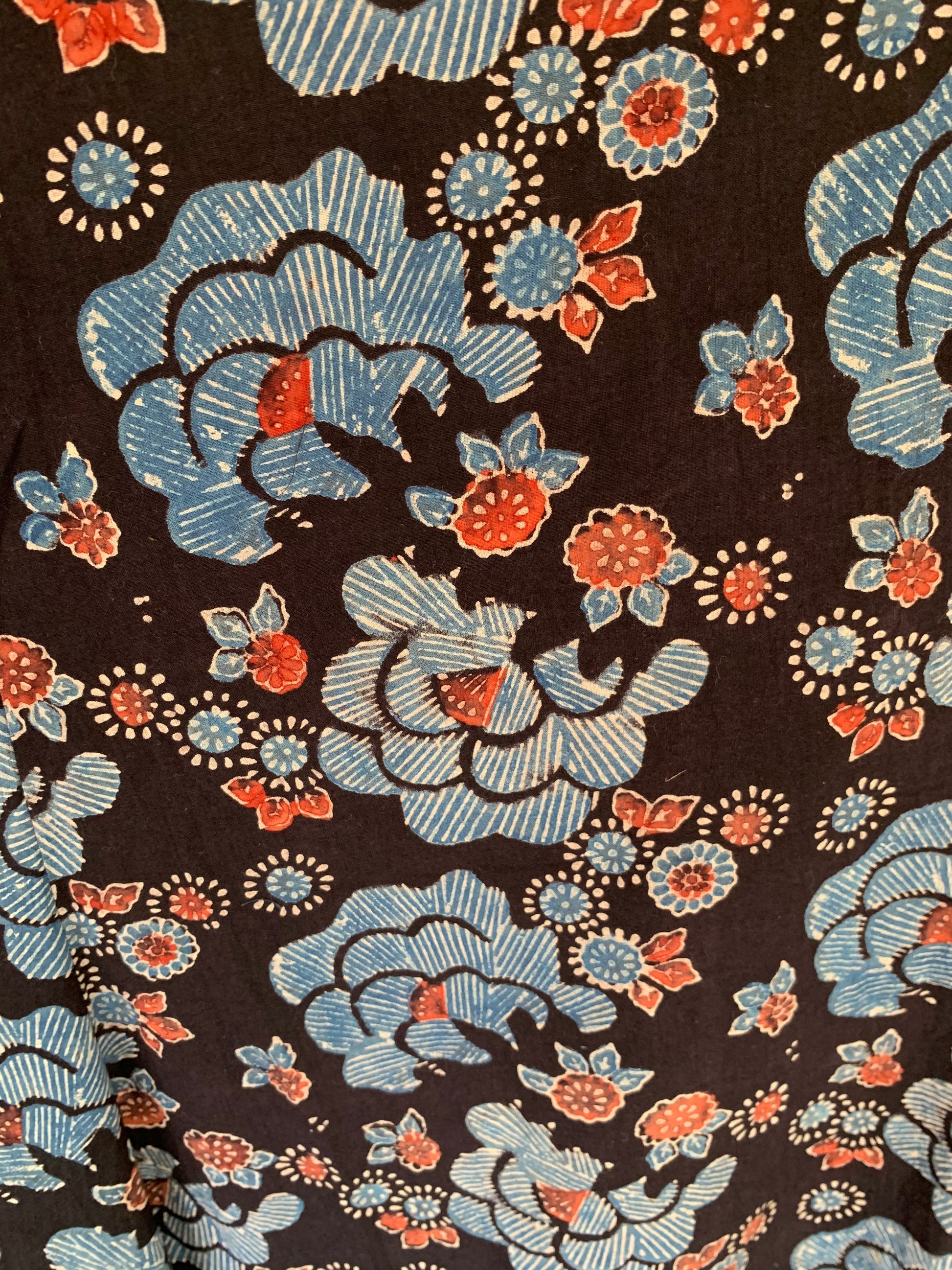 This stunning black jumpsuit features a complex blue and red floral block print. The intricate pattern and breezy wide-leg cut create a chic, easy-to-wear.