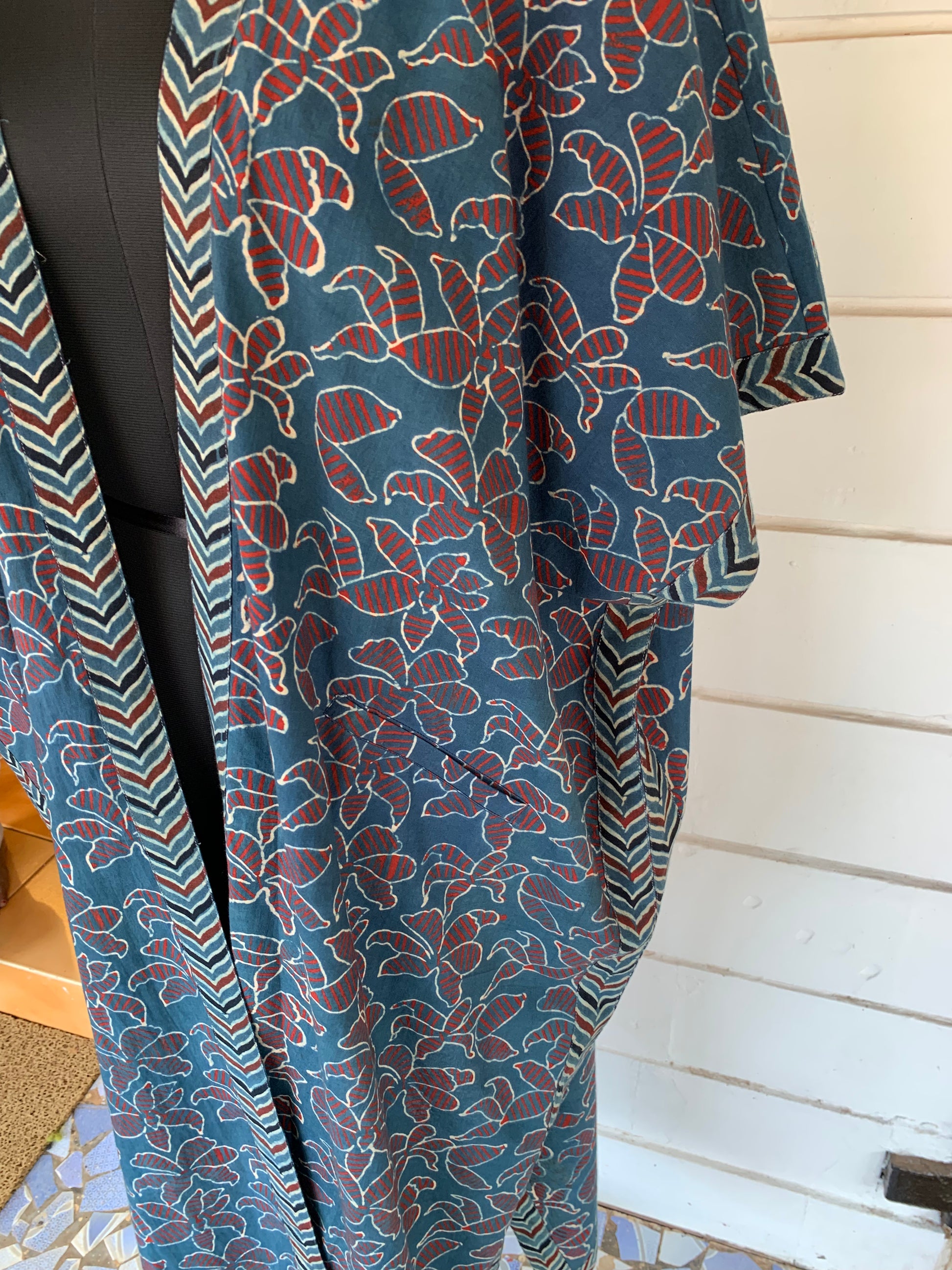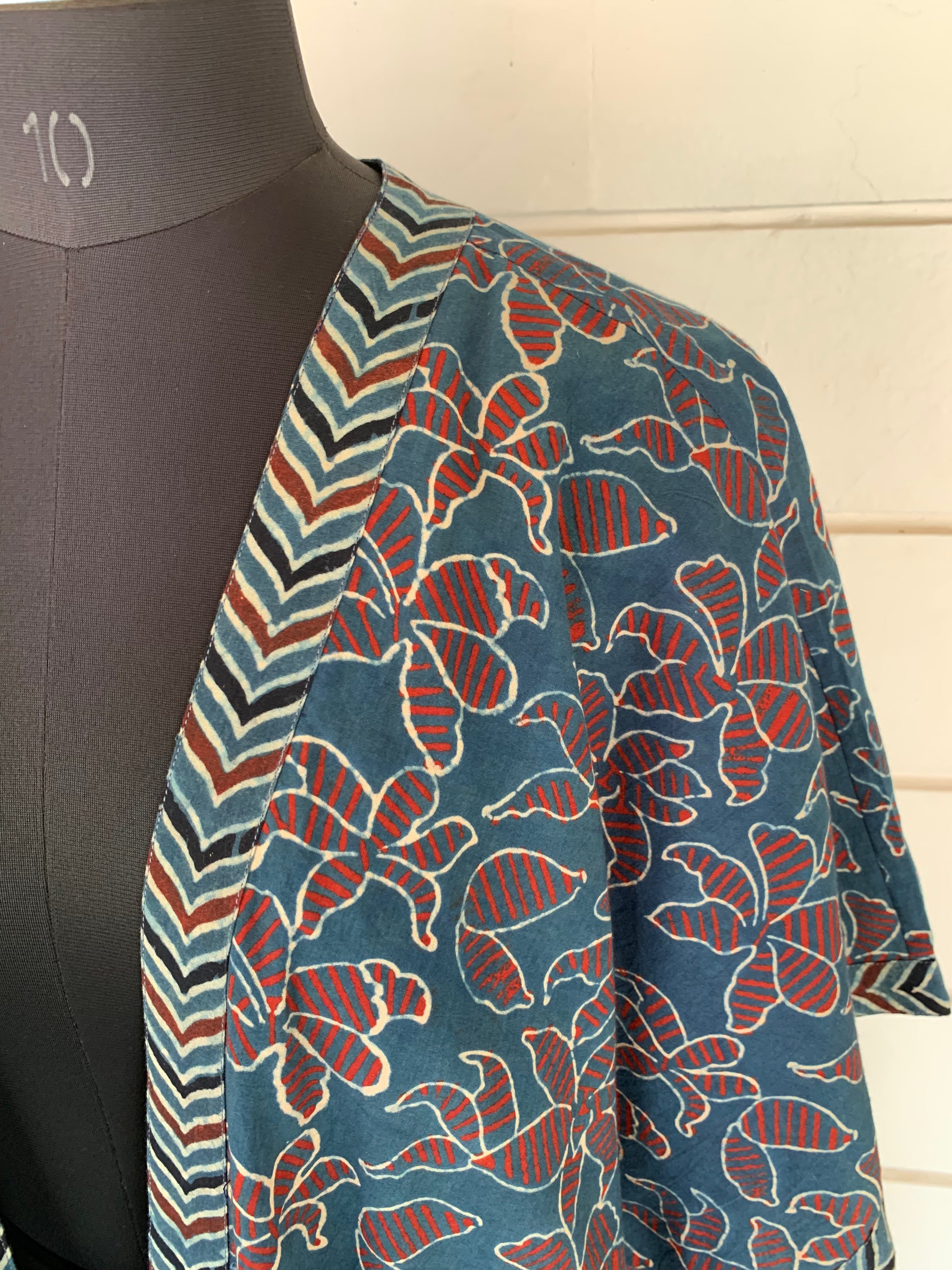 This sophisticated blue kimono shrug features a complex, detailed Ajrakh block print. The modern layering piece crafted from soft cotton for comfort.