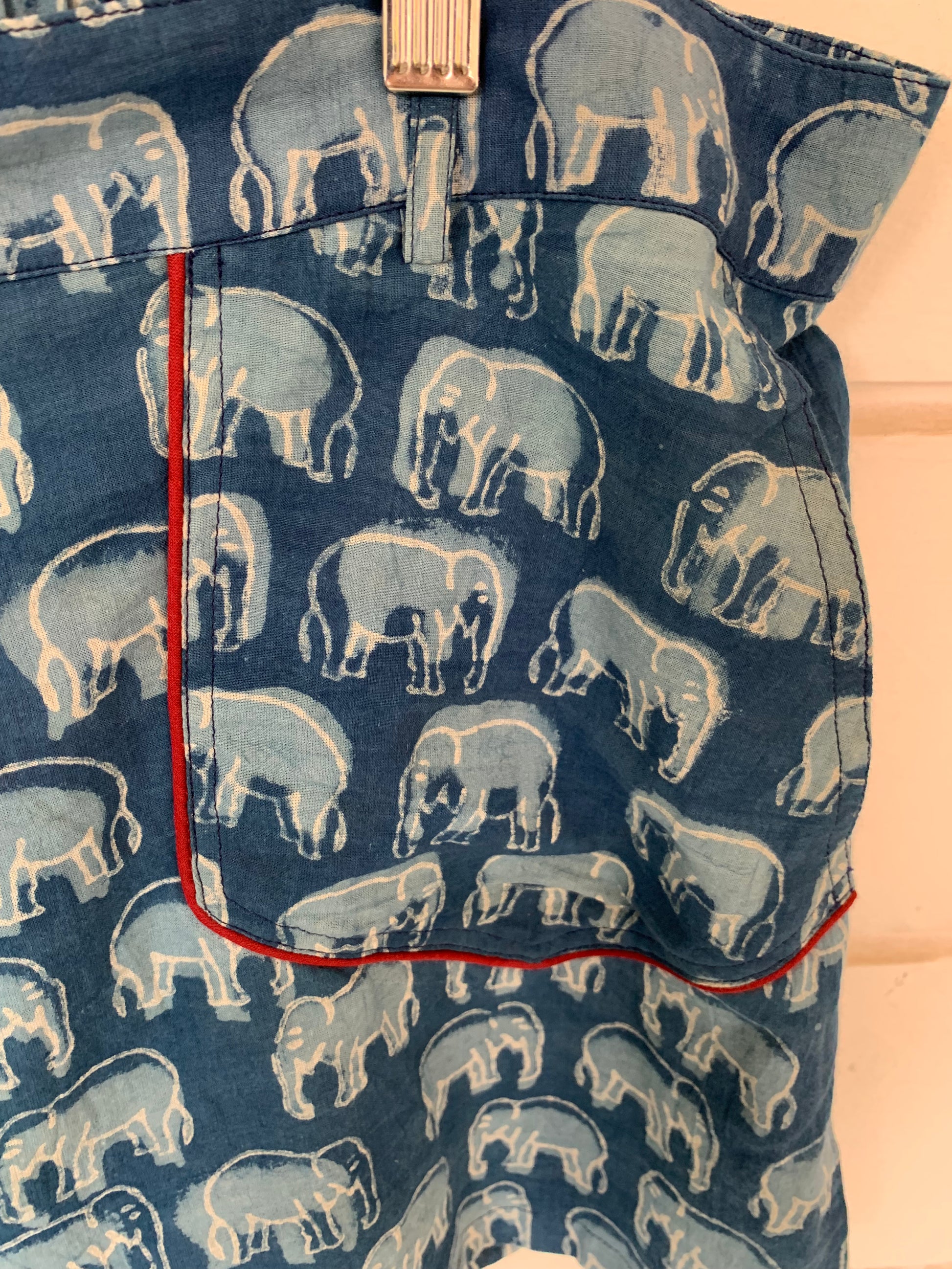 Make a playful statement in these charming blue elephant print shorts. The comfortable cotton and unique block print offer a personalized, breathable style.