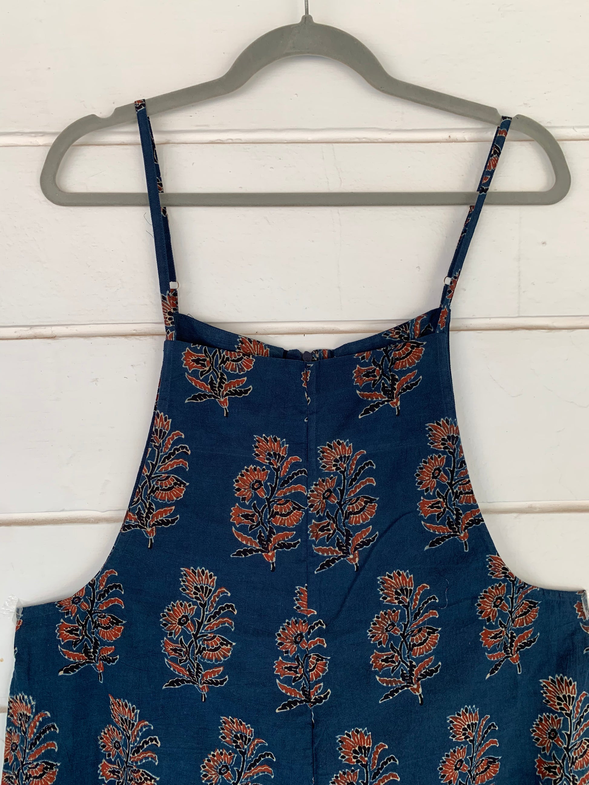 This elegant blue jumpsuit features a striking orange and black floral block print. The intricate pattern and breezy wide-leg cut create a sophisticated, comfortable look.