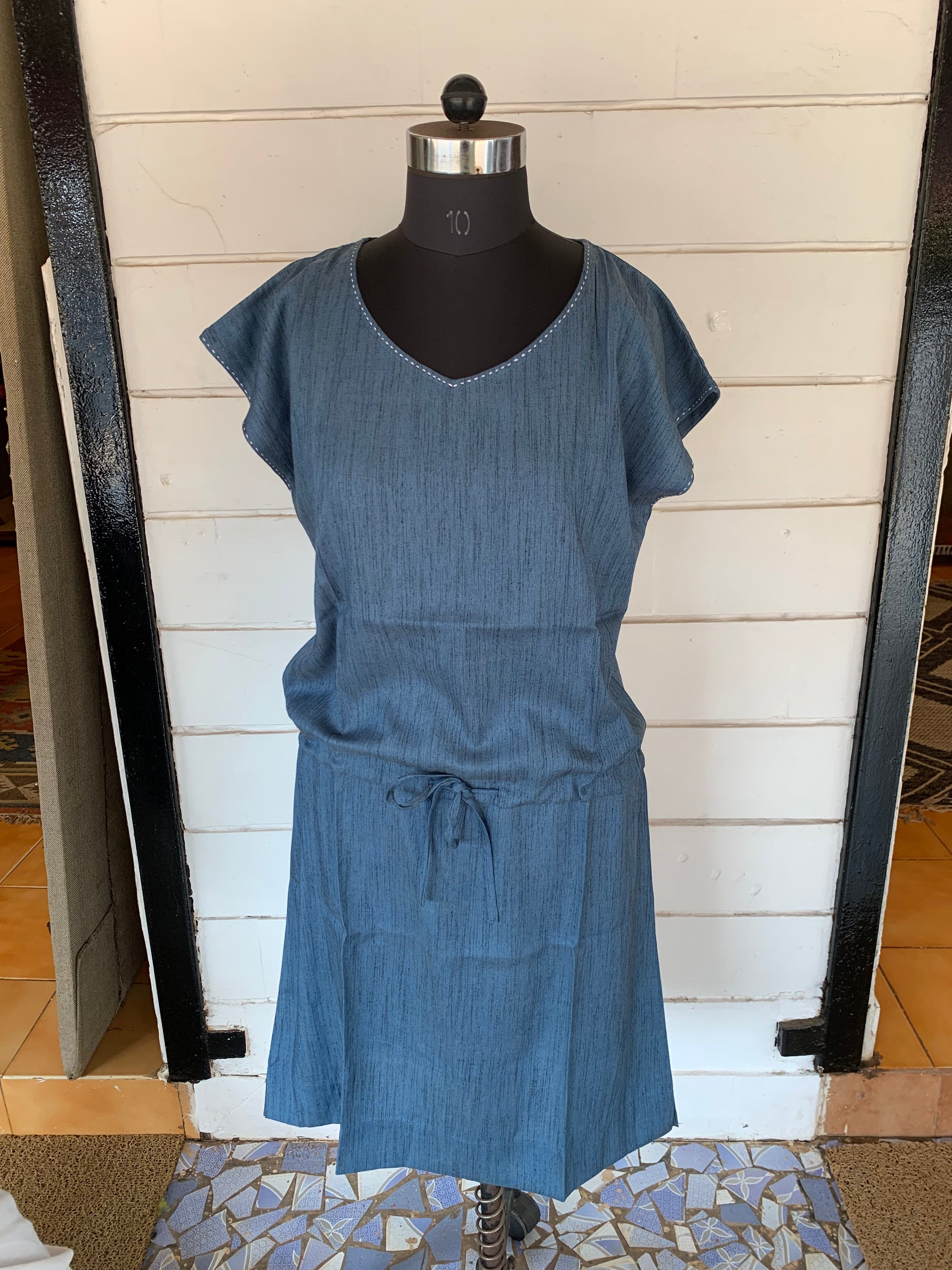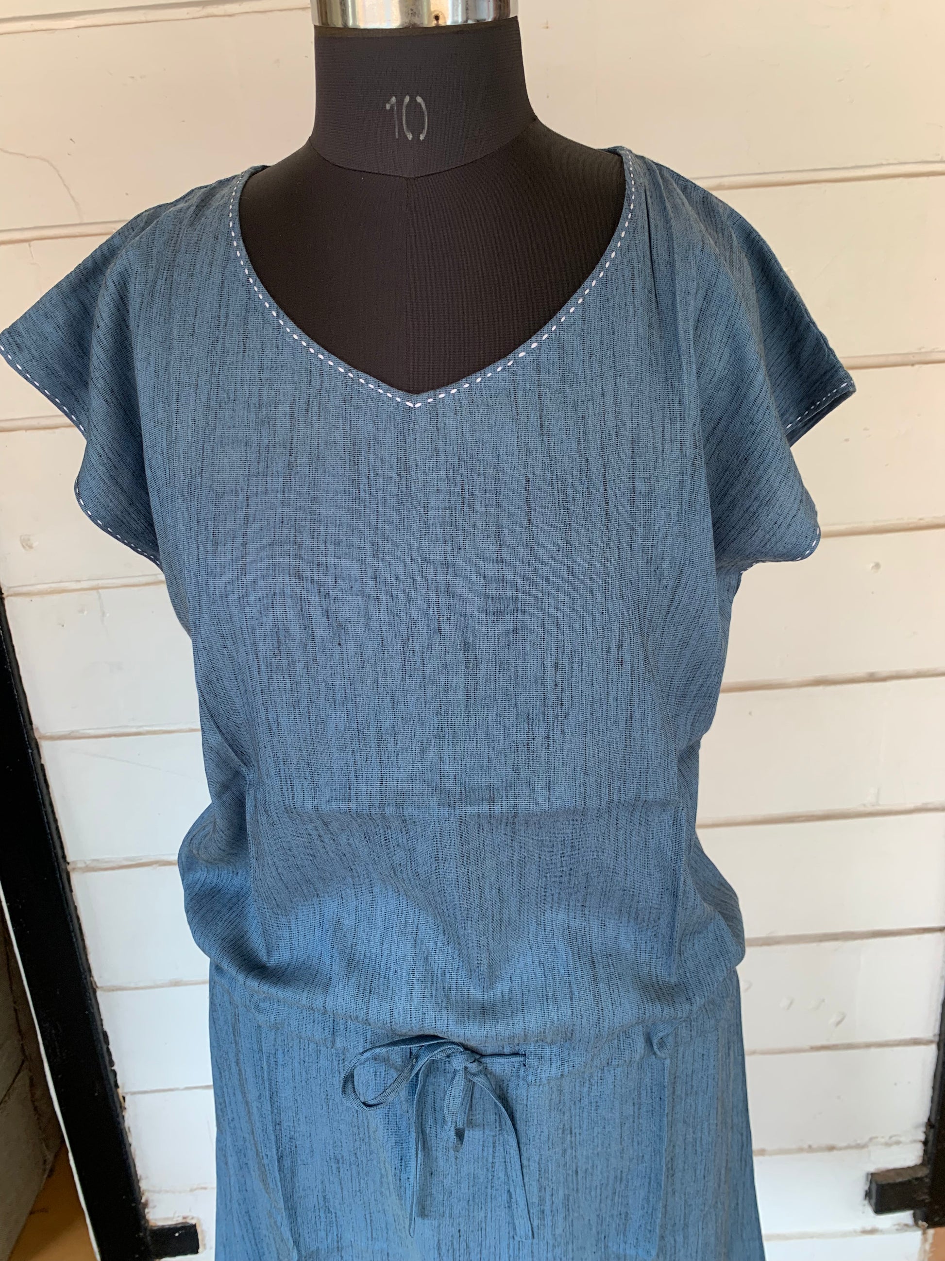 Blue Linen Pixie Dress with White Kanta Stiches