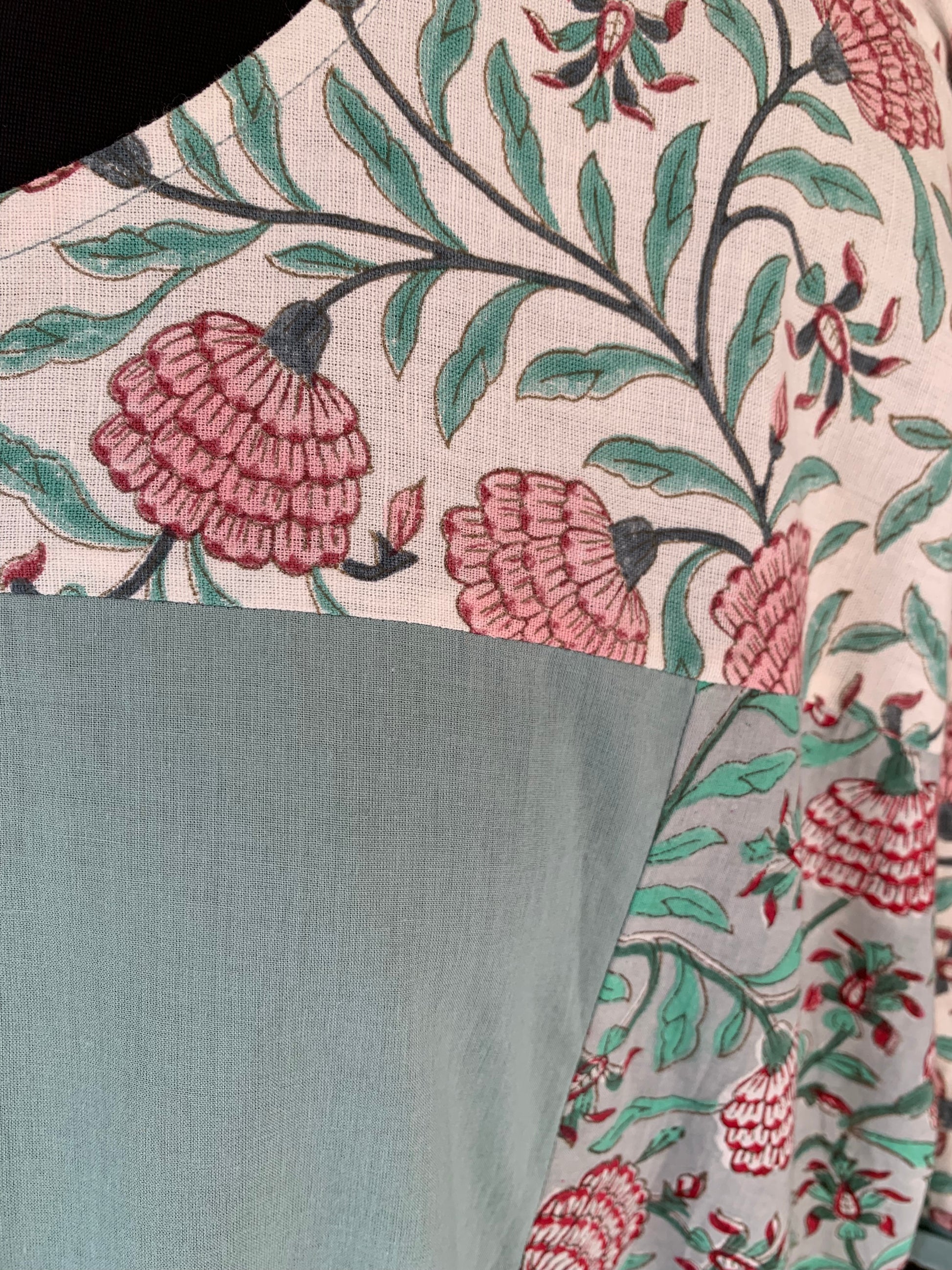 Elevate your wardrobe with a Floral Patchwork Cotton Dress. Hand block printed with feminine pink blooms and a modern color block.