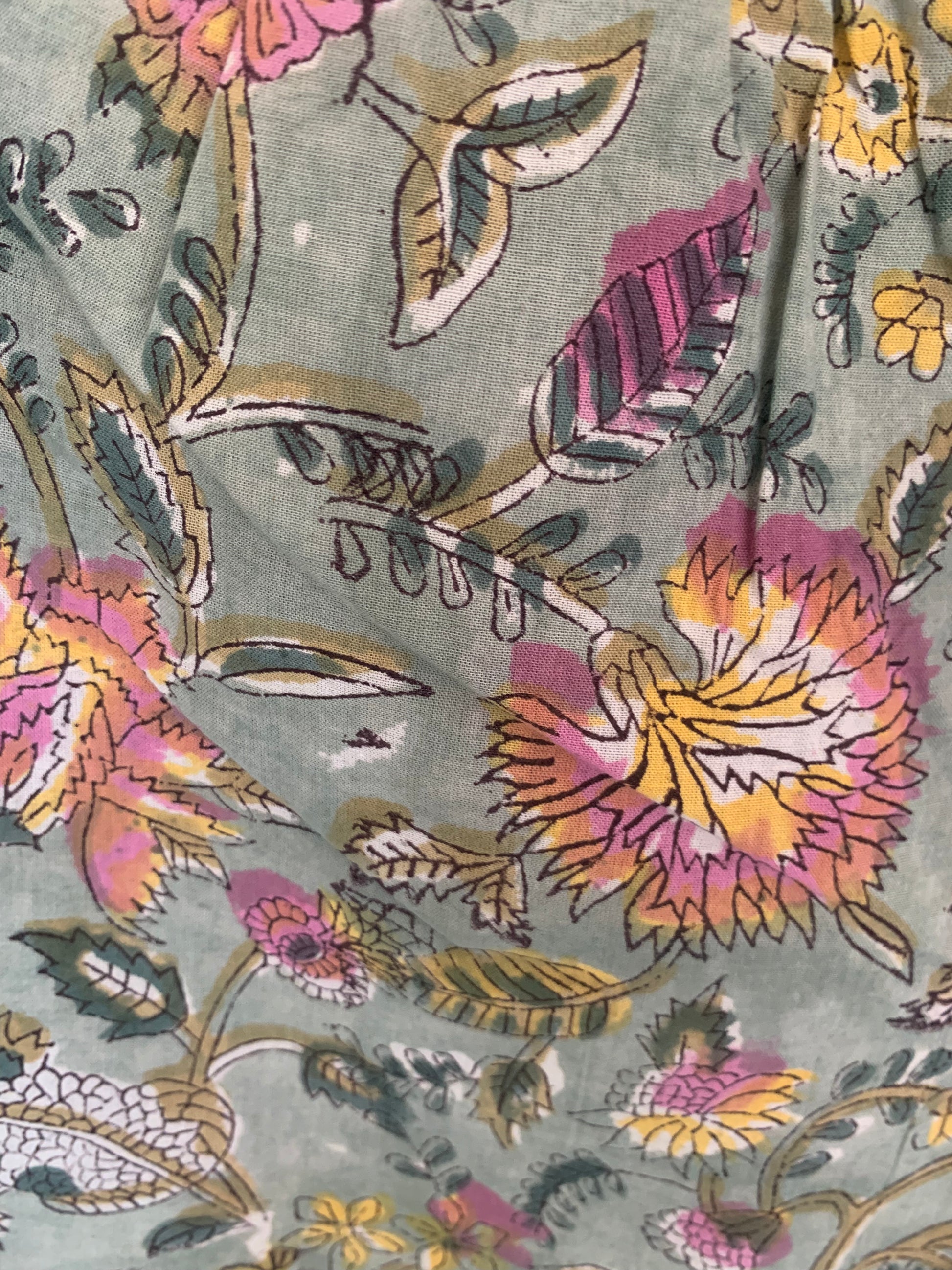 - Block Print: Soft sage green base highlighted by floral prints.