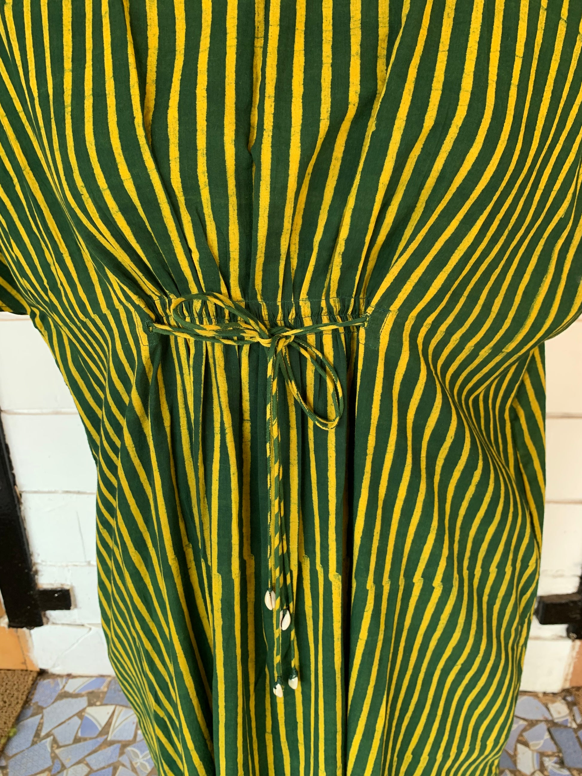 This vibrant striped dress captures attention with its striking green and yellow block print. Designed with a flattering drawstring waist, it’s a comfortable, handcrafted statement piece perfect for sunshine.