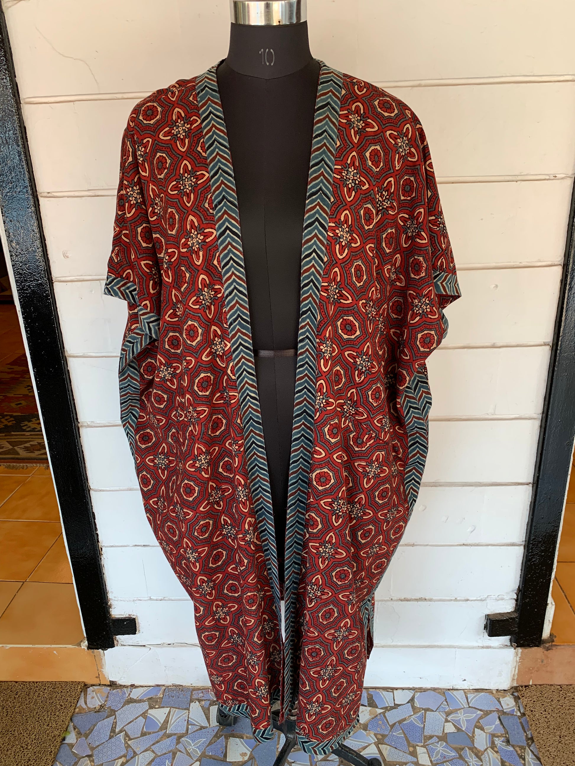 This sophisticated red kimono shrug features a complex, detailed Ajrakh block print. The modern layering piece crafted from soft cotton for comfort.