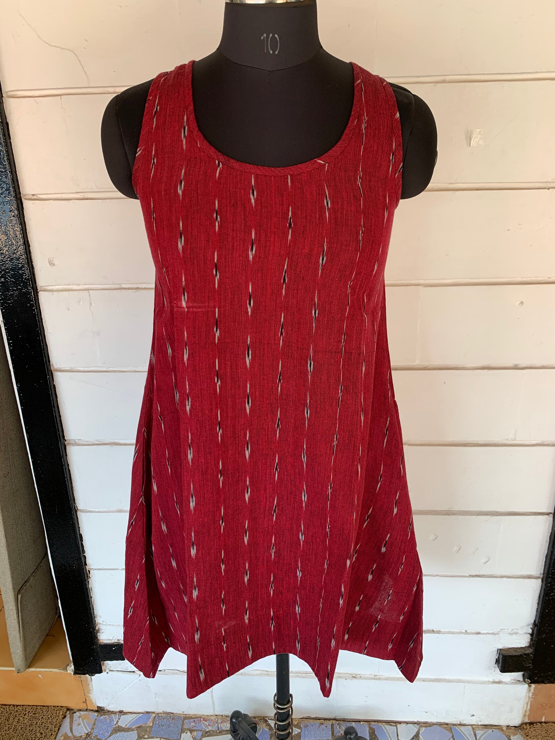 Make a confident statement in this deep red ikat A-line dress. The breathable cotton fabric and subtle striped pattern offer personalized cool comfort.