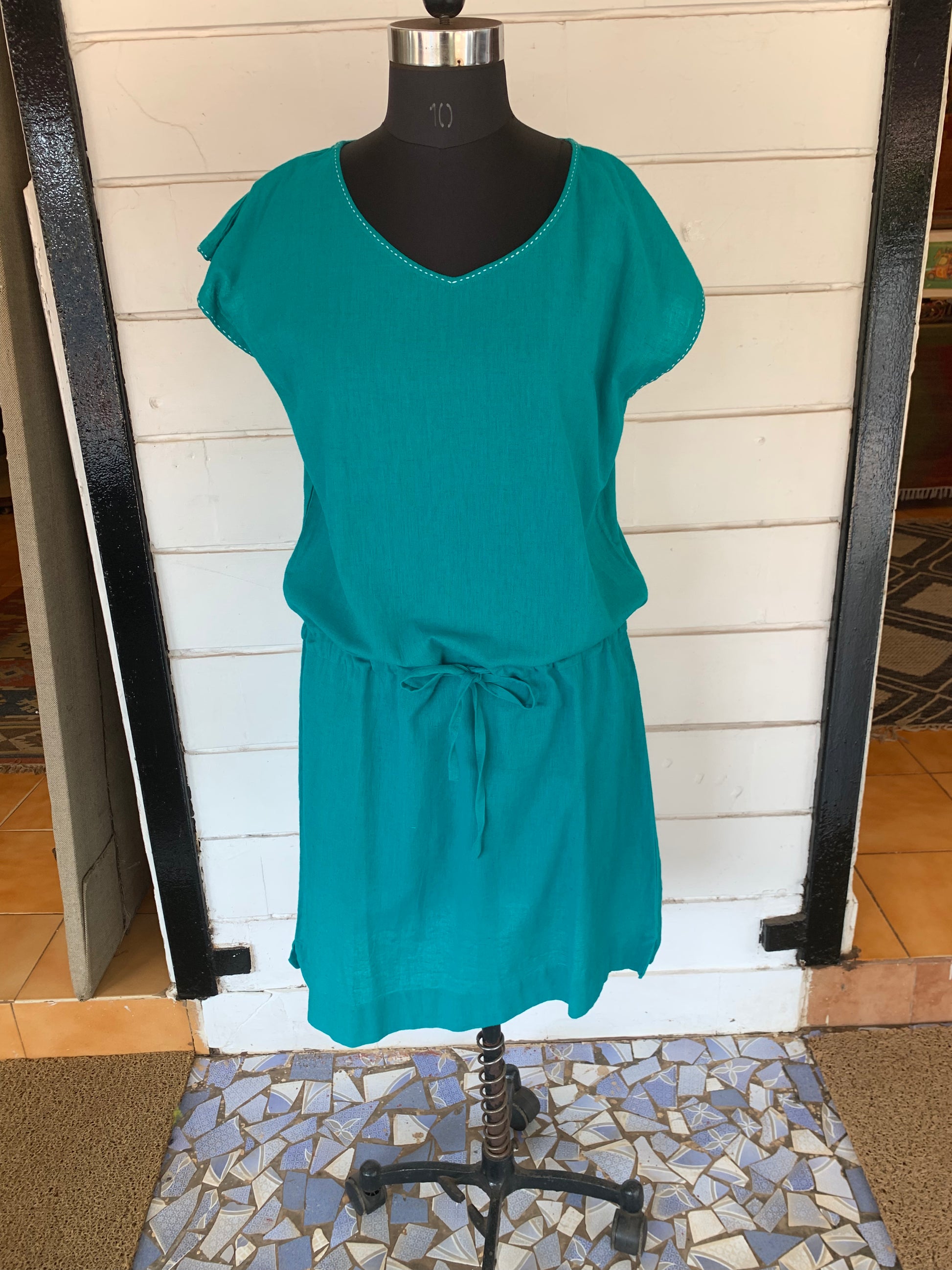Teal Linen Pixie Dress with White Kanta Stiches