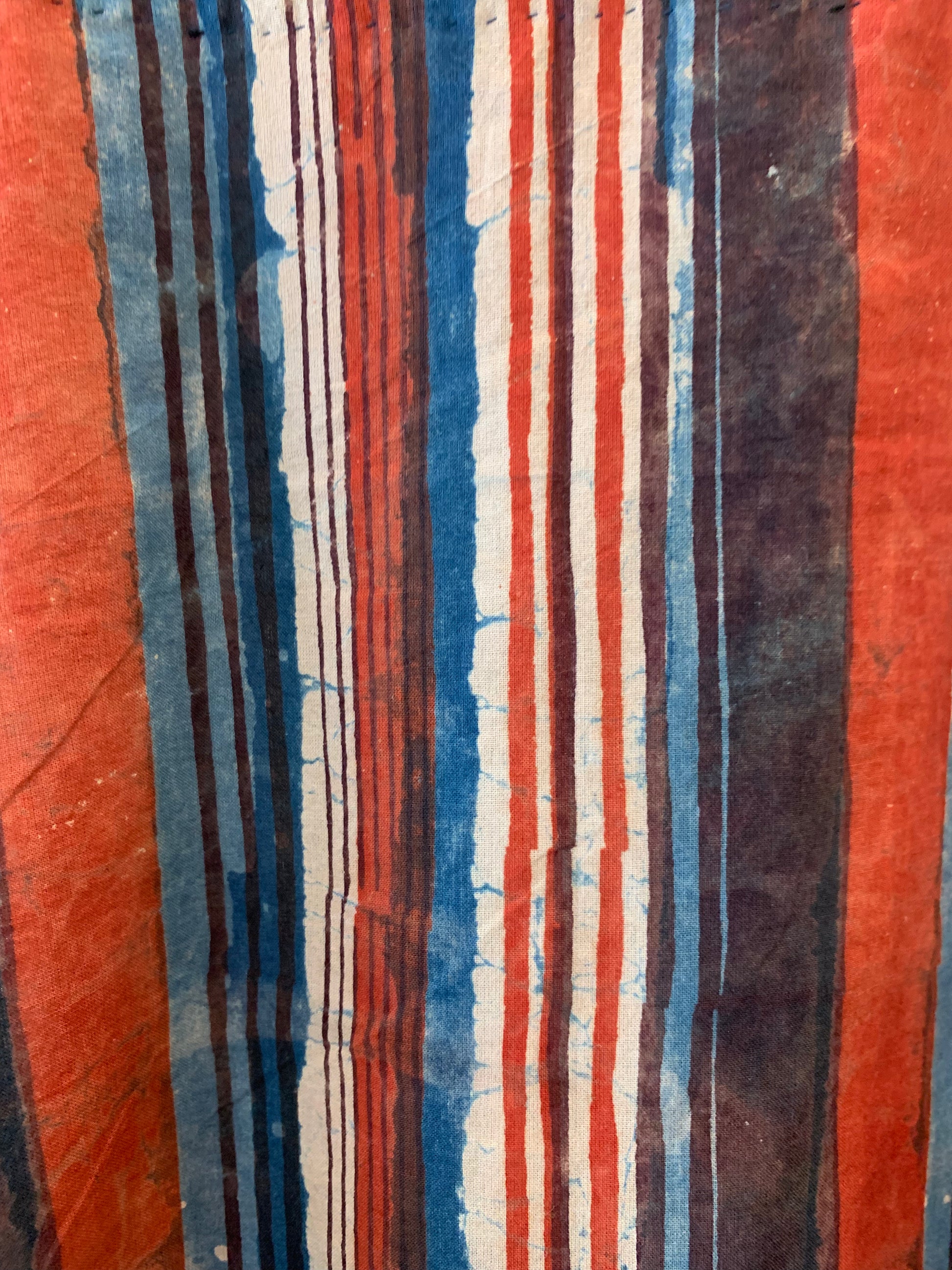 The stunning Bella Boxy Top, showcasing a beautiful blend of deep reds, blues, and blacks in a vertical stripe pattern.